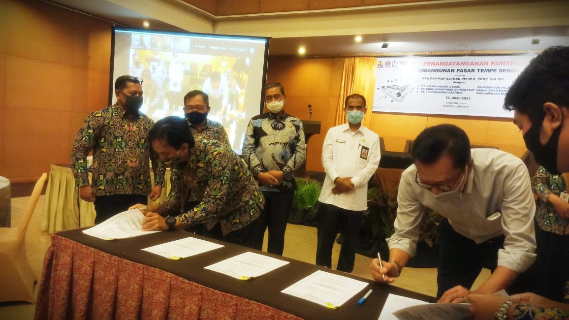 KOSONGSATUNEWS.COM–Bupati Wajo, Dr Amran Mahmud hari ini melakukan penandatanganan kontrak paket pembangunan Pasar Tempe, di Ruang Jasmine Lantai II, Hotel Claro Kota Makassar, Rabu (14/10/2020).