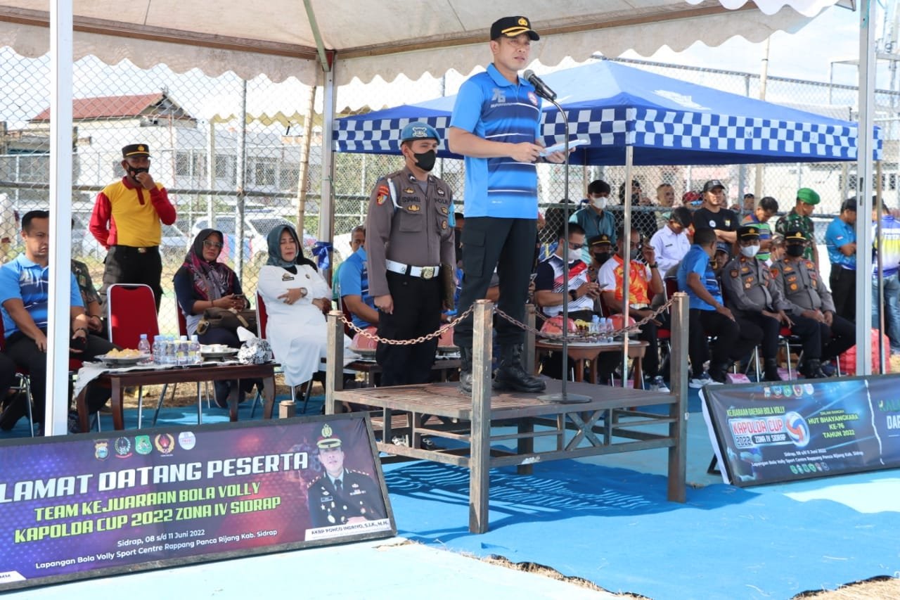 Kapolres Sidrap AKBP Ponco Indriyo. S.I.K., MH memimpin upacara pembukaan turnamen bola voli Kapolda Sulsel Cup dalam rangka HUT Bhayangkara ke 76, bertempat di Lapangan Sport Center, Kelurahan Lalebata Kecamatan Panca Rijang Kabupaten Sidrap, Rabu (08/6/2022) Sore