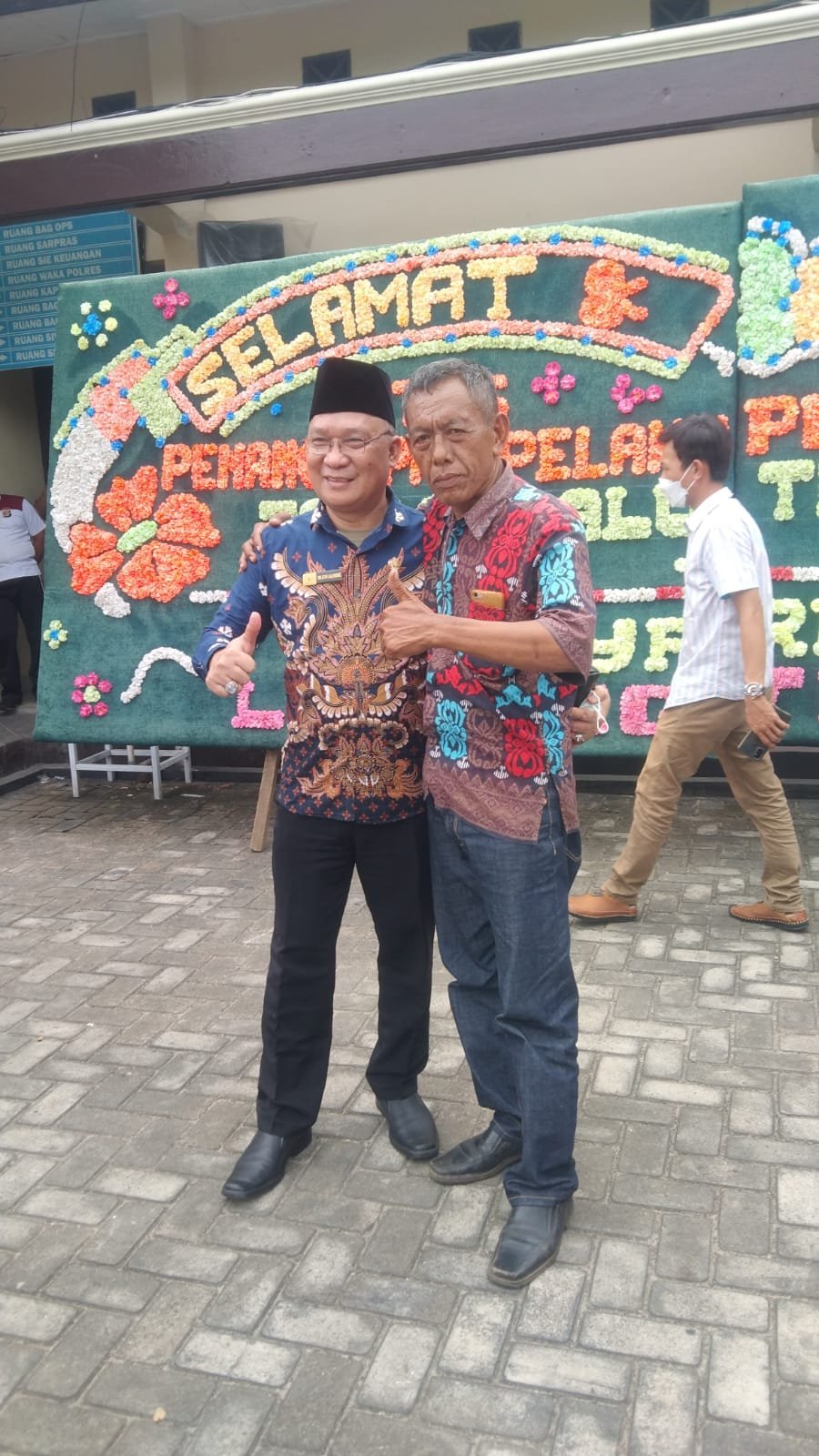 Penasehat hukum tersangka, Ujang Kosasih juga mengajukan pertanyaan terhadap saksi bahwa apakah benar papan bunga yang ada di halaman Polres itu merupakan kiriman dari tokoh adat yang ada di Lampung Timur ?