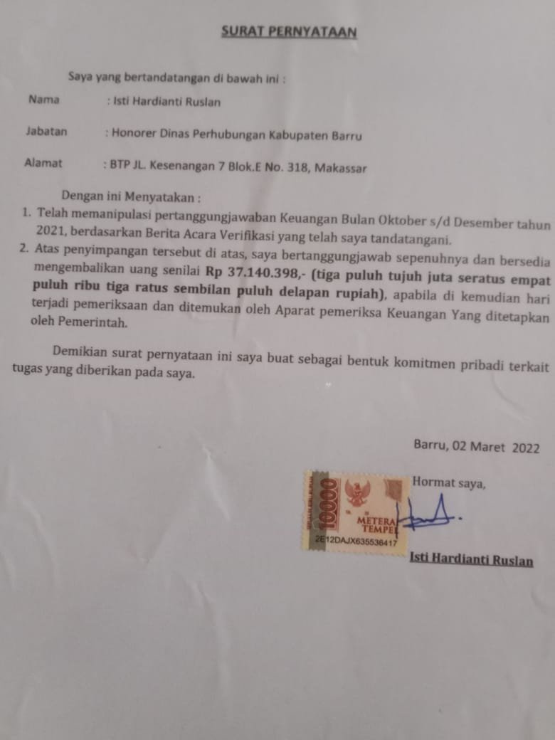 “Benar adanya bahwa nama tersebut kami sudah berikan surat pemecatan sebagai honorer karna melakukan pelanggaran penyelewengan dana SPPD anggaran Dishub Barru,”jelas kata Anshar Tahir mantan Kadishub Barru yang saat ini menjabat sebagai kepala Kesbangpol Barru. Jumat (17/6/2022).