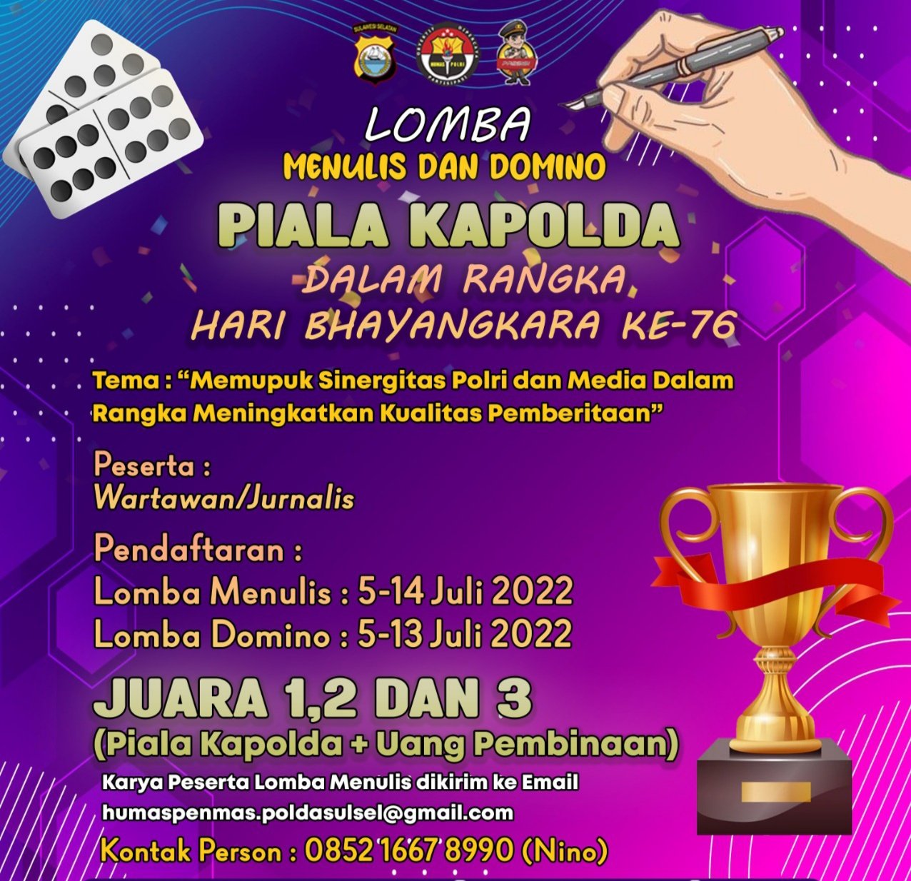 Polda Sulsel adakan lomba menulis dan domino sebagai rangkaian di Hari Bhayangkara ke-76 tahun, dengan tema “Memupuk sinergitas polri dan media dalamrangka meningkatkan kualitas pemberitaan”