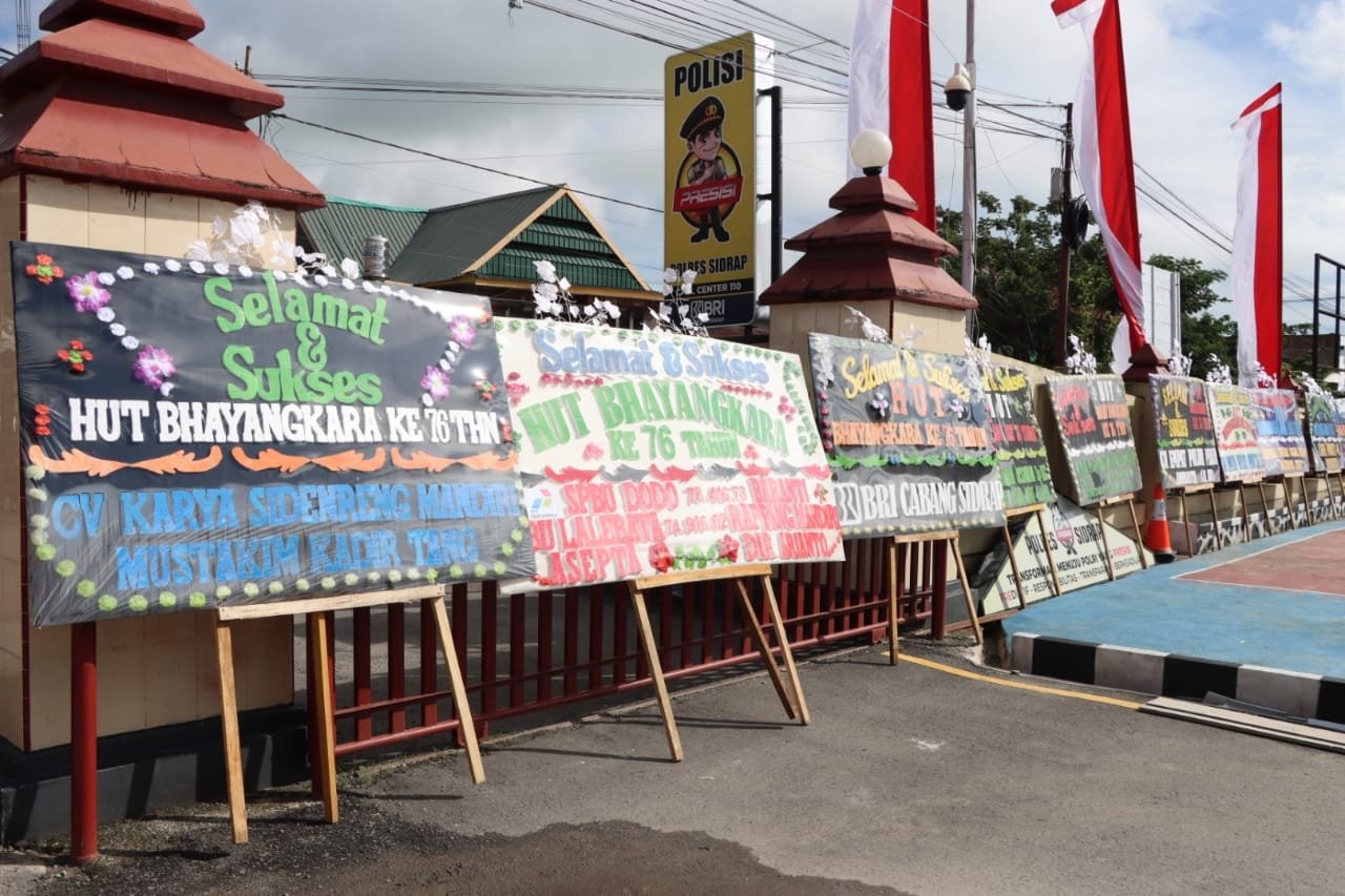 Ratusan karangan bunga ucapan selamat Hari Ulang Tahun (HUT) Bhayangkara Ke – 76 menghiasi Mako Polres Sidrap. Selasa, (5 /7/2022).