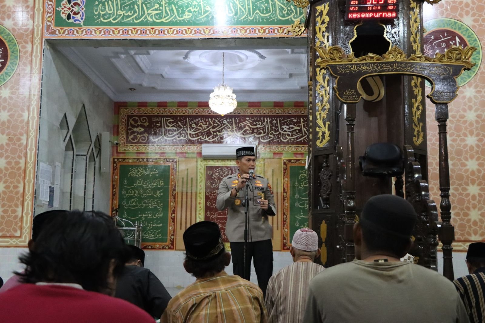 Usai melaksanakan shalat subuh berjamaah, Kapolres Sidrap memperkenalkan diri dan menyampaikan pesan Hakamtibmas di hadapan para jamaah masjid.