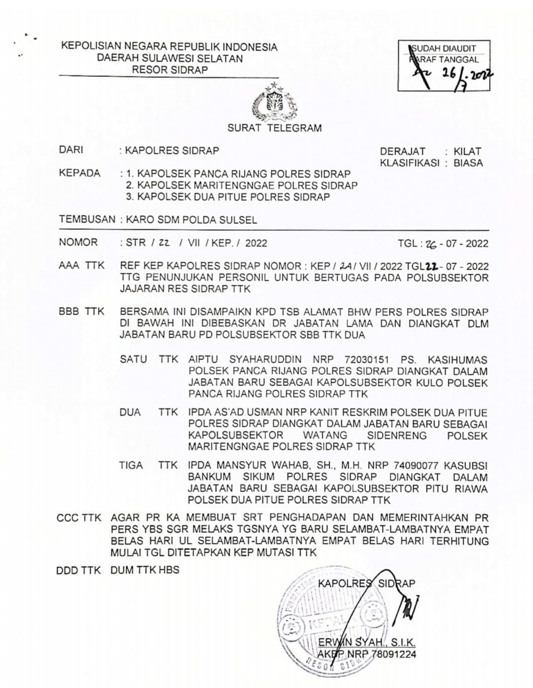 Kapolres Sidrap, AKBP Erwin Syah mengankat tiga personilnya dijabatan baru sebagai Kapolsubsektor di tiga wilayah Kecamatan di Kabupaten Sidenreng Rappang, yakni. Kecamatan Watang Sidenreng, Pitu Riawa dan Kulo