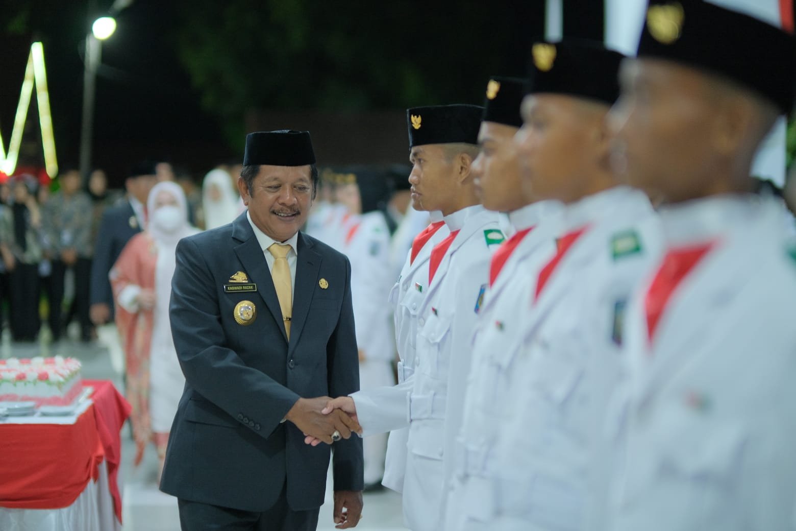 “Tentu pelaksanaan yang kita lakukan ini adalah merupakan suatu hal yang biasa yaitu pemotongan kue yang merupakan simbol kesyukuran kita kepada Allah SWT karena malam ini kita hadir bersama menyaksikan acara ini. tak lupa saya menyampaikan terima kasih kepada para anggota Paskibraka yang telah melaksanakan tugas dengan baik. Jadikan ini sebagai suatu pengalaman yang berharga karena kalian merupakan orang-orang terpilih untuk melaksanakan kegiatan ini”, katanya.