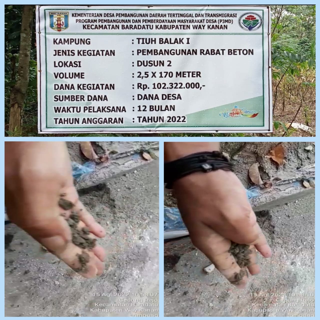 Diberitakan sebelumnya bahwa Pekerjaan rabat beton kampung Tiuh Balak Satu yang diduga asal jadi dan tidak ada keterbukaan publik, dimana prihal pekerjaan tersebut terpantau oleh kamera tim gabungan Awak Media Kabar-Investigasi.Com dan beberapa LSM serta Ormas Pada hari 15/Agustus/2022.
