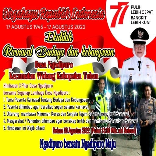 Pada karnaval tahun 2022 ini,TK ,SD , MI ,Paud , Seluruh Warga Masyarakat desa Ngadipuro Yang antusias mengikuti pawai kemerdekaan HUT ke – 77 Merdeka .
