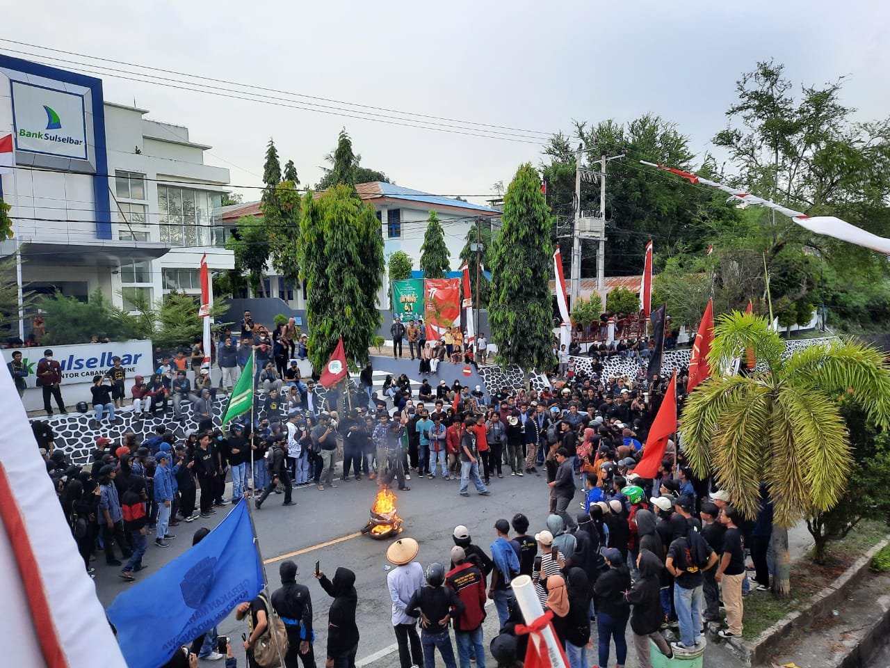 Tak hanya itu, disela-sela aspirasinya para mahasiswa juga membakar ban sebagai bentuk penolakan keras atas kebijakan-kebijakan pemerintah yang dinilai tidak memihak rakyat.