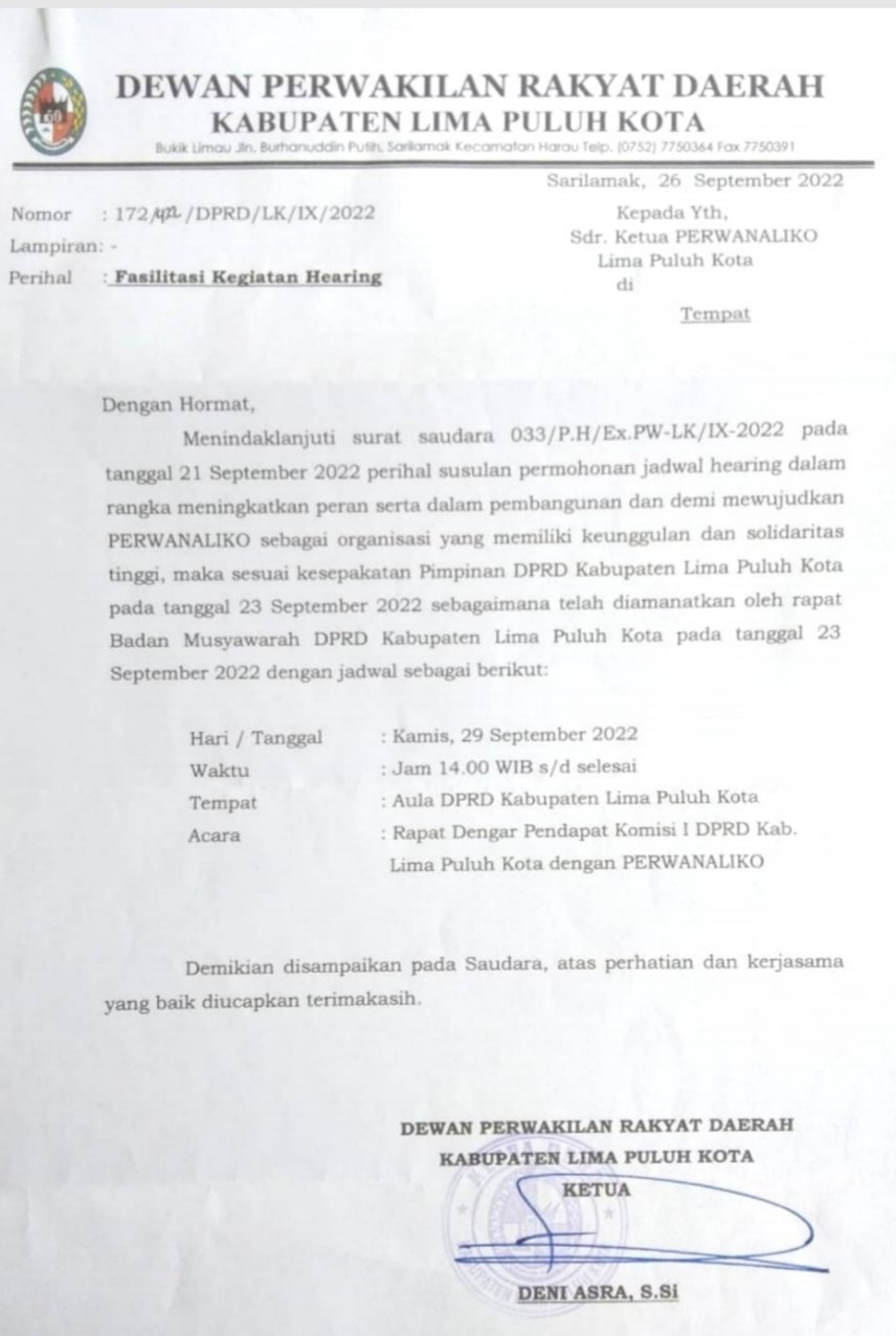 Hearing Komisi I DPRD Limapuluh Kota dan Perwanaliko (Persatuan Wali Nagari Limapuluh Kota) yang terjadwal Kamis 29 September 2022 Jam 14.00 hendak diliput oleh awak media atas undangan Ketua Perwanaliko, Sundahri SE MM.