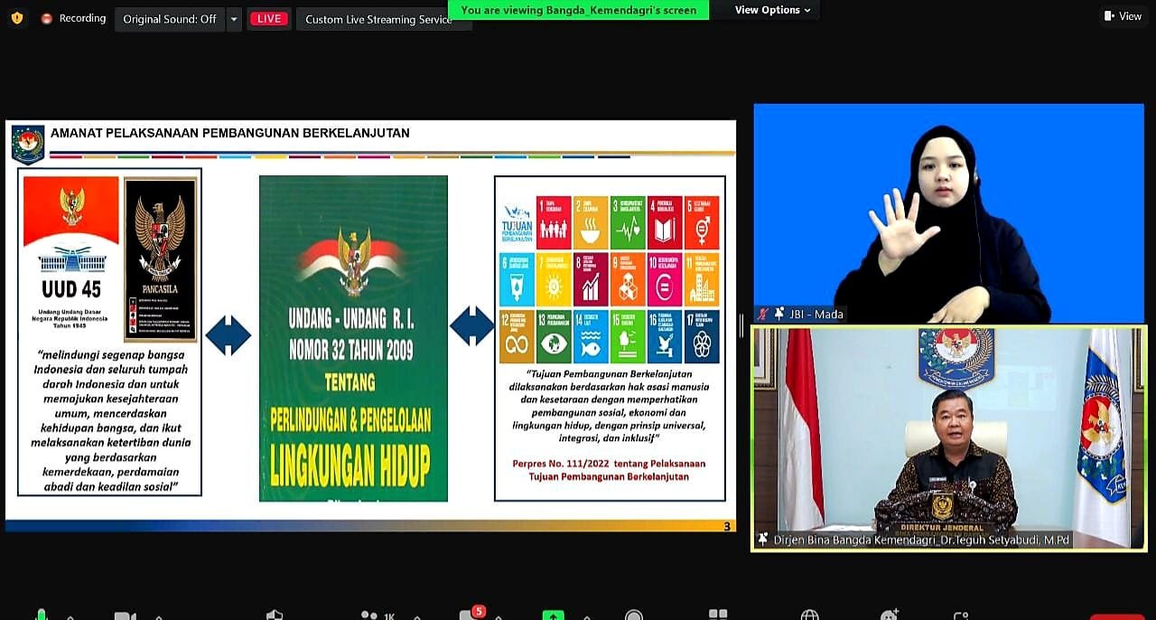 JAKARTA, – Direktur Jenderal Bina Pembangunan Daerah Kementerian Dalam Negeri Teguh Setyabudi memberikan arahan kepada pemerintah daerah dalam sosialisasi Peraturan Presiden Nomor 111 Tahun 2022 tentang Pelaksanaan Pencapaian Tujuan pembangunan Berkelanjutan (TPB/SDGs), yang diselenggarakan oleh Kementerian PPN/Bappenas pada Selasa (18/10/2022).