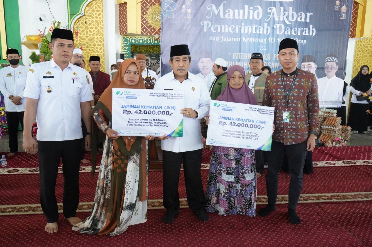 Ahli waris dua petugas syara peserta Badan Penyelenggara Jaminan Sosial Ketenagakerjaan (BPJamsostek) di Kabupaten Sidrap, menerima santunan jaminan kematian, Kamis (20/10/2022). Penyerahan berlangsung di sela peringatan Maulid Akbar Nabi Muhammad SAW tingkat kabupaten di Masjid Agung Sidrap.