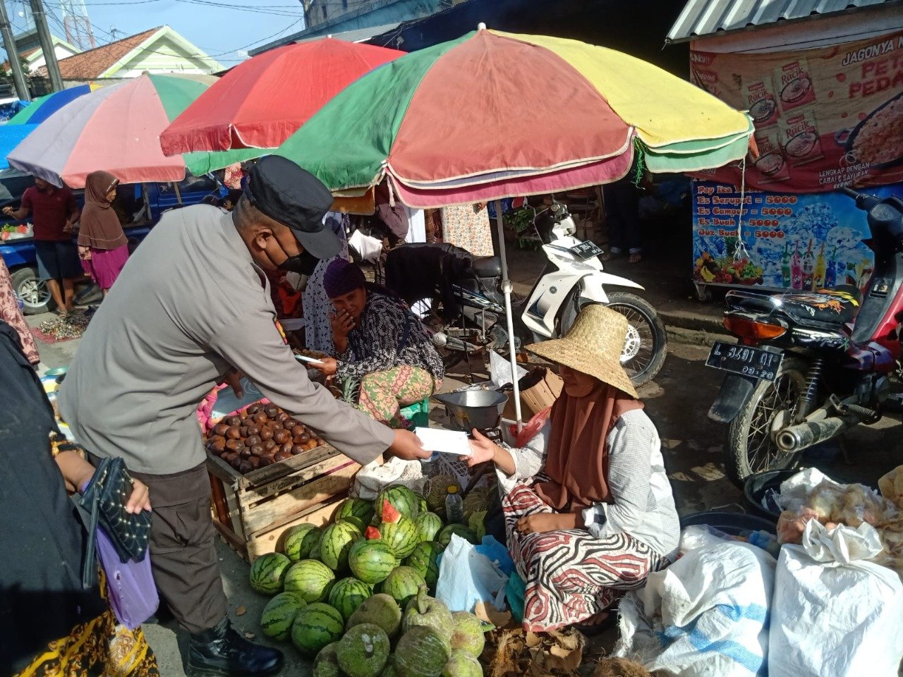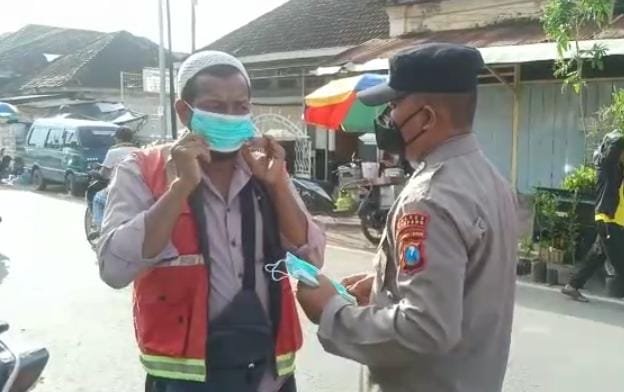 Selain melakukan penjagaan dan pengaturan arus lali lintas mengantisipasi kemacetan dan gangguan Kamtibmas, Bripka Haris Sugianto dan anggota lainnya juga membagikan masker kesehatan kepada para pedagang, sopir angkutan pedesaan serta masyarakat yang melewati depan pasar polowijo.