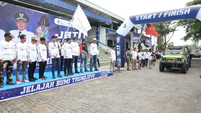 SAMPANG – Bupati Sampang H. Slamet Junaidi ditemani Wakil Bupati Sampang H. Abdullah Hidayat melepas sebanyak 84 Peserta Offroad Extreme Jelajah Bumi Trunojoyo I, di depan GOR Indoor, Sampang, Sabtu (26/11/2022).