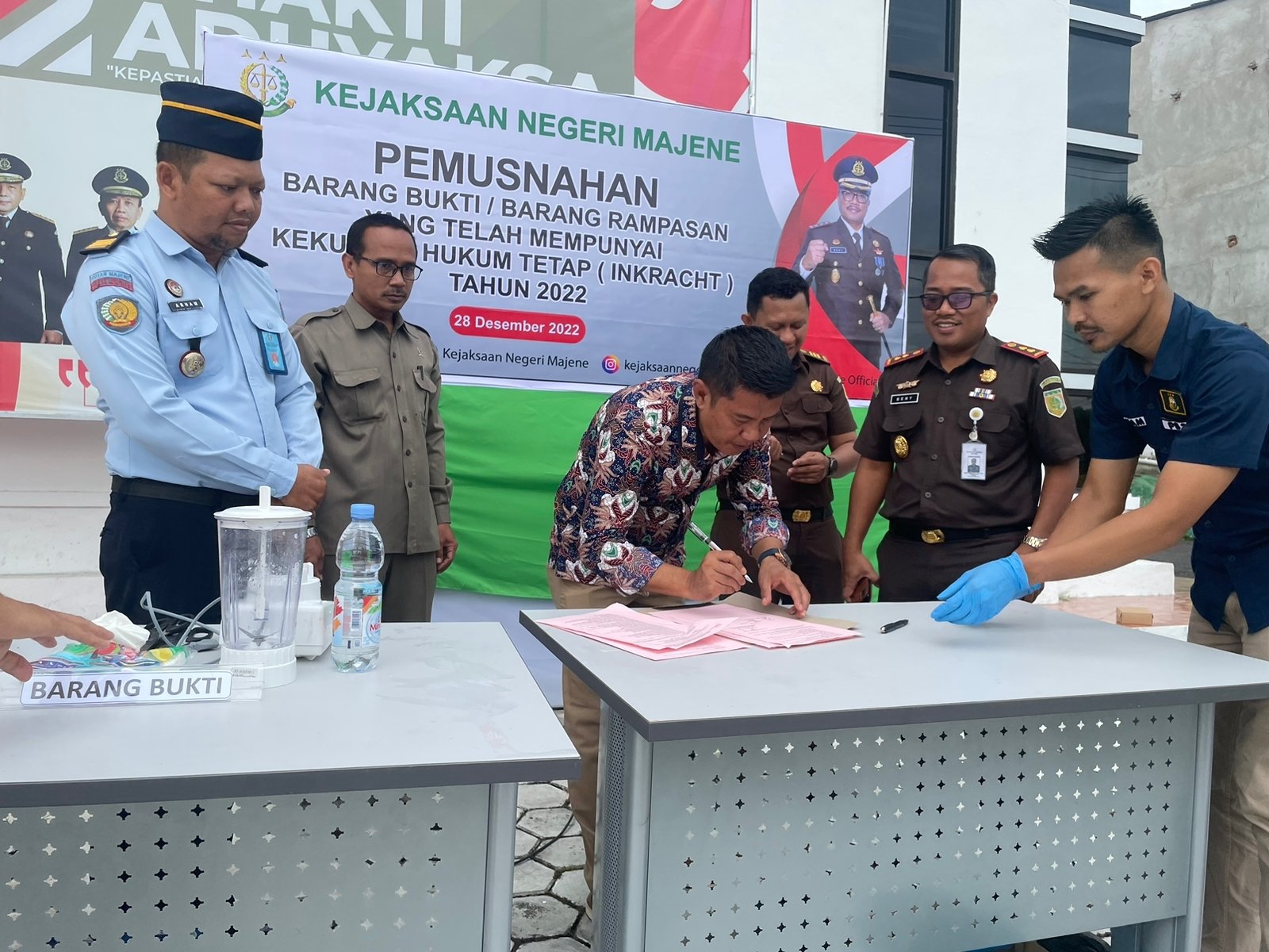 Polres Majene – Mewakili Kapolres Majene AKBP Febryanto Siagian, Kasat Reskrim Iptu Budi Adi menghadiri pemusnahan barang bukti hasil tindak kejahatan di kantor Kejaksaan Negeri, Rabu (28/12/22).