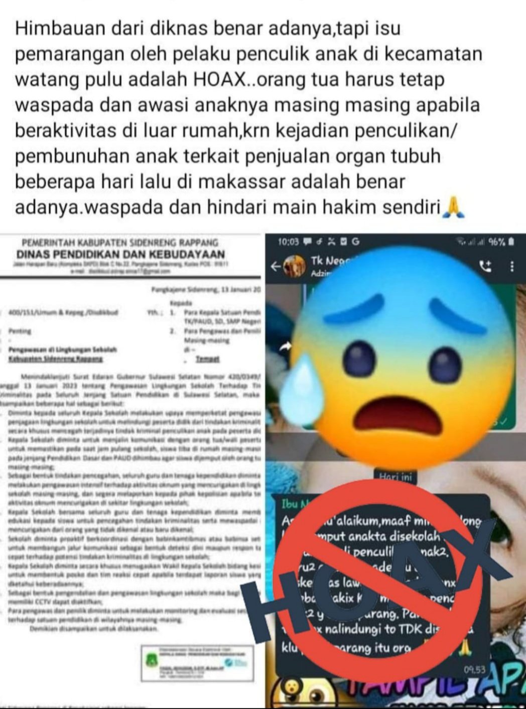 Dan Terkait dengan isu penculikan anak yang beredar di Medsos di wilayah Kec. Watang Pulu, Sidrap. Sampai dengan selasa sore ini, pihaknya belum menerima laporan adanya kasus penculikan anak dan itu merupakan Isu tidak benar atau *HOAX*. Namun demikian Polres Sidrap dan jajaran tetap melakukan pemantauan dan patroli setiap pagi siang dan malam. (Mds)