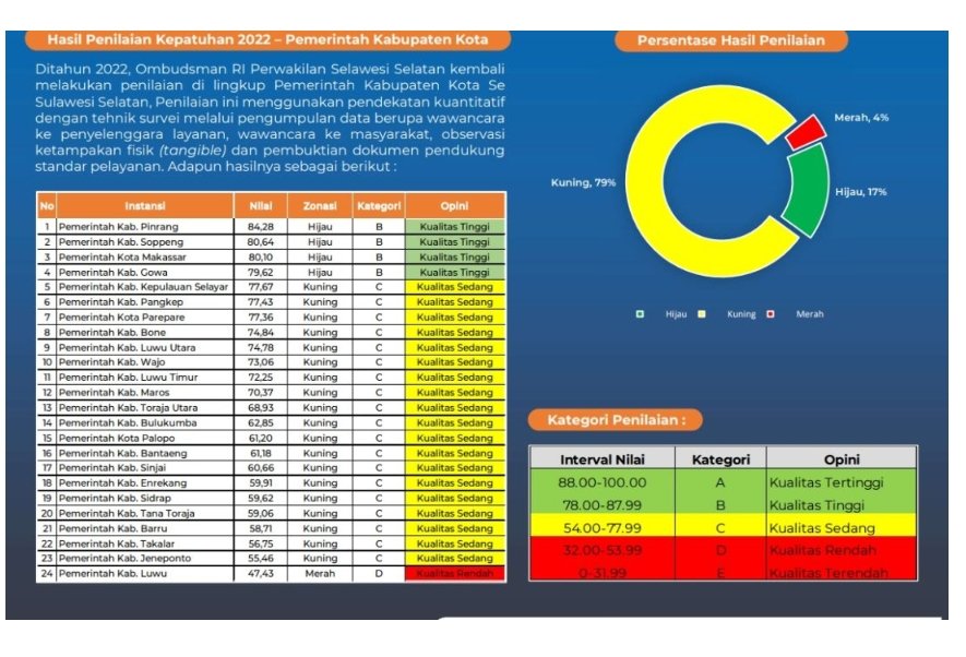 Pemerintah kabupaten Pinrang meraih poin tertinggi se – Provinsi Sulawesi selatan pada penilaian kepatuhan terhadap standar pelayanan publik yang dinilai oleh Ombudsman Republik Indonesia tahun 2022.