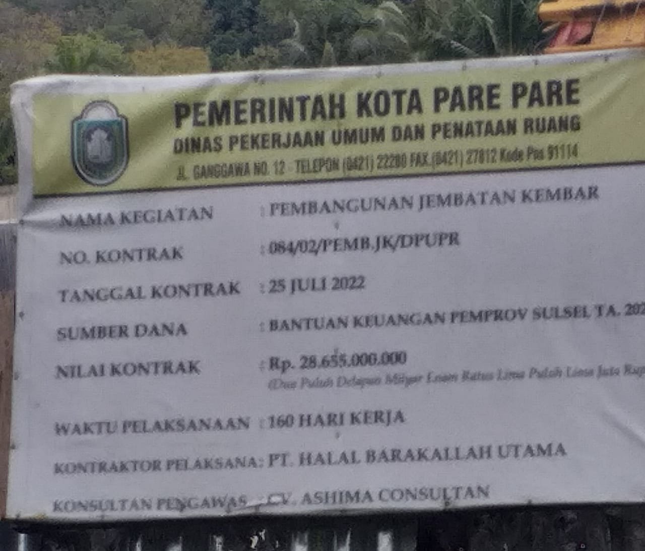 Masa kontrak pengerjaan jembatan kembar di mulai Tanggal 25 Juli, hingga batas waktu 31 Desember 2022. Pemenang tender PT. Halal Barakallah Utama.
