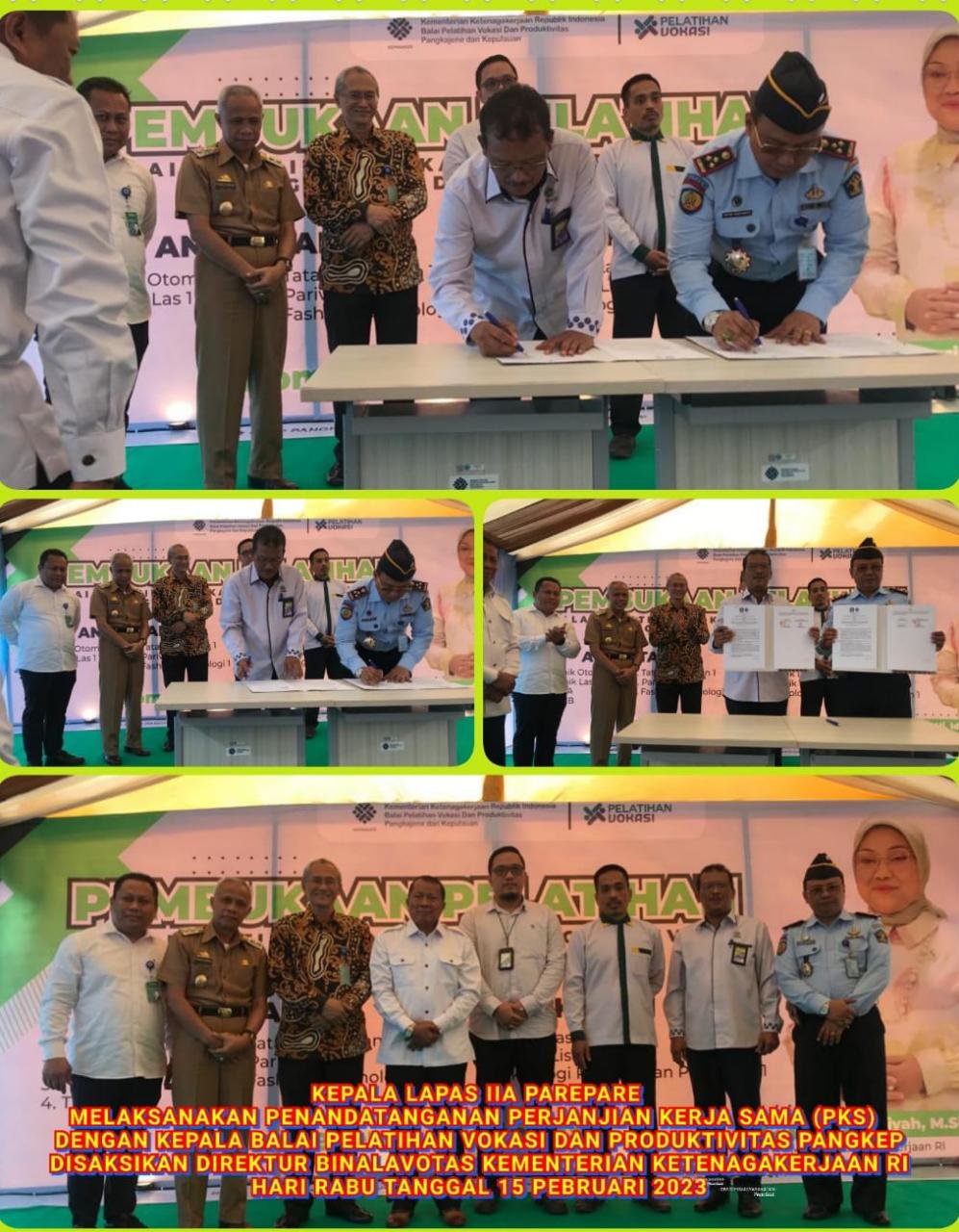 Lembaga Permasyarakatan Kelas IIA Parepare melaksanakan penandatanganan Perjanjian Kerja Sama (PKS) dengan Kepala Balai Pelatihan Vokasi dan Produktivitas (BPVP) Pangkep, Sulsel. Rabu (15-02-2023)