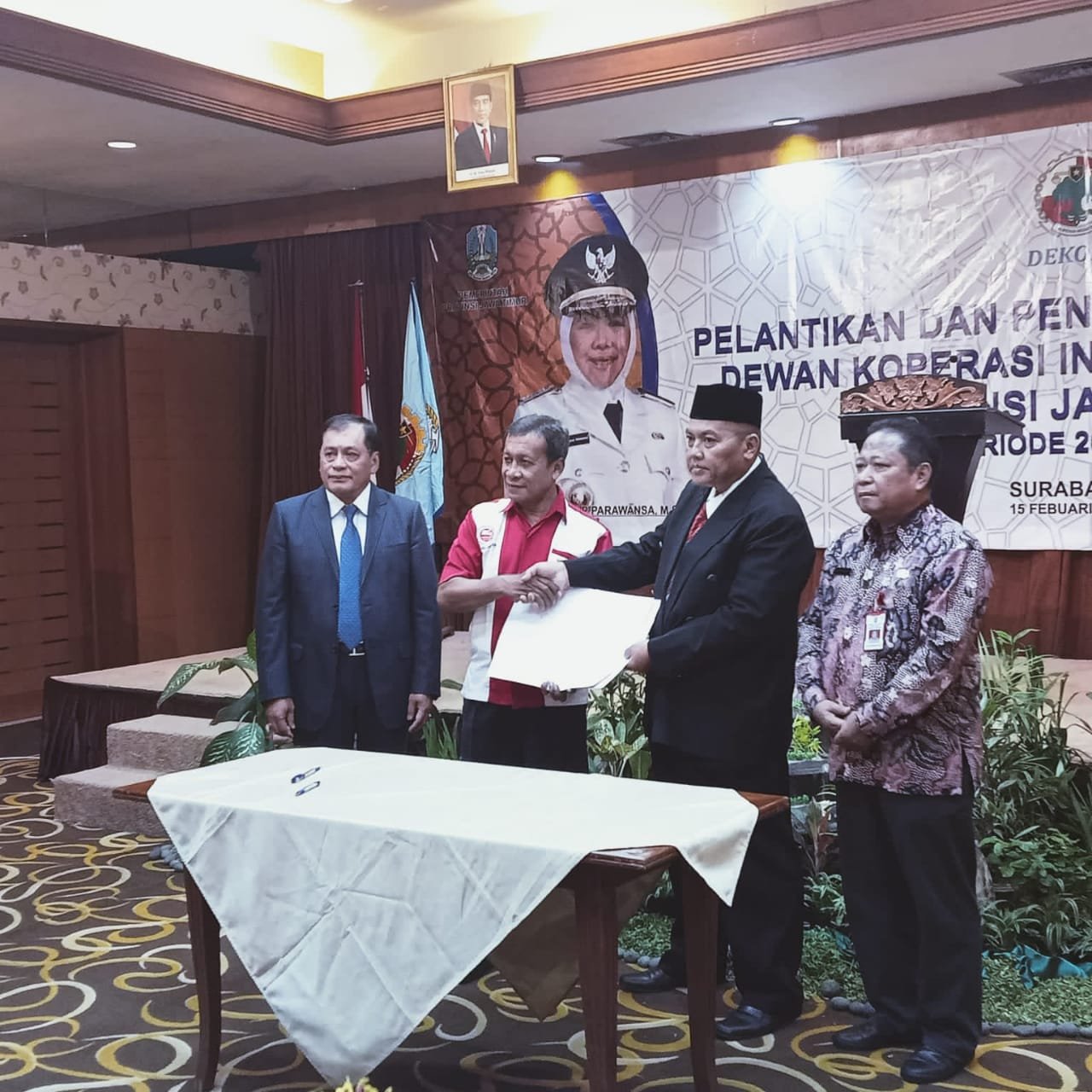 Surabaya jawa timur – Dewan Koperasi Indonesia Wilayah Jawa Timur (Dekopinwil) menggelar pengukuhan pimpinan Dekopinwil Jawa Timur periode 2022-2025 oleh gubernur Jawa Timur yang Di bacakan Assisten ekonomi dan pembangunan Provinsi jawa Timur atas arahan gubernur jawa timur di hotel Bisanta Surabaya hari ini, Rabu (15/2).