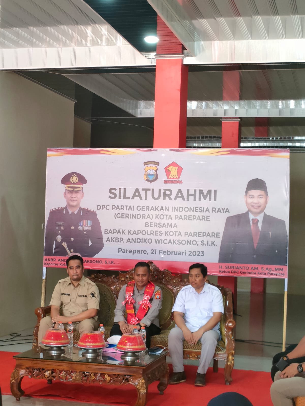 Kosongsatunews.com – Parepare, Kapolres parepare AKBP Andiko Wicaksono, SIK, beserta rombongan melakukan kunjungan silaturrahmi ke sekretatlriat DPC Partai Gerindra kota Parepare di jalan Salo karajae, Selasa (21/2/2023)