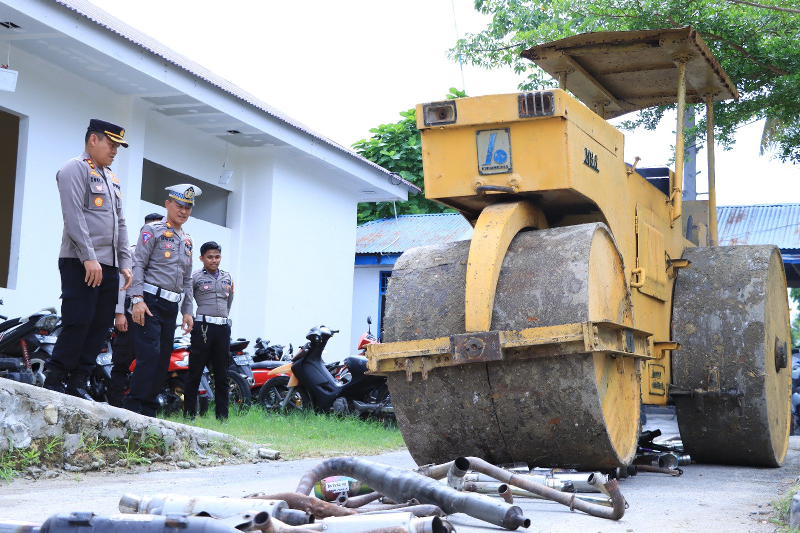 Tak hanya itu, 115 knalpot bogar yang diamankan juga langsung dimusnahkan dengan cara dilindas menggunakan alat berat.