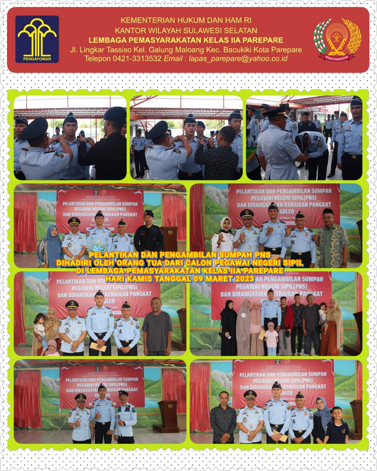 Kegiatan yang dirangkaikan dengan penyematan tanda pangkat bagi pegawai berlangsung di Lembaga Pemasyarakatan Kelas IIA Parepare Kantor Wilayah Kementerian Hukum dan HAM Sulawesi Selatan. Kamis, 9 Maret 2023, sekitar pukul 08-30 wita