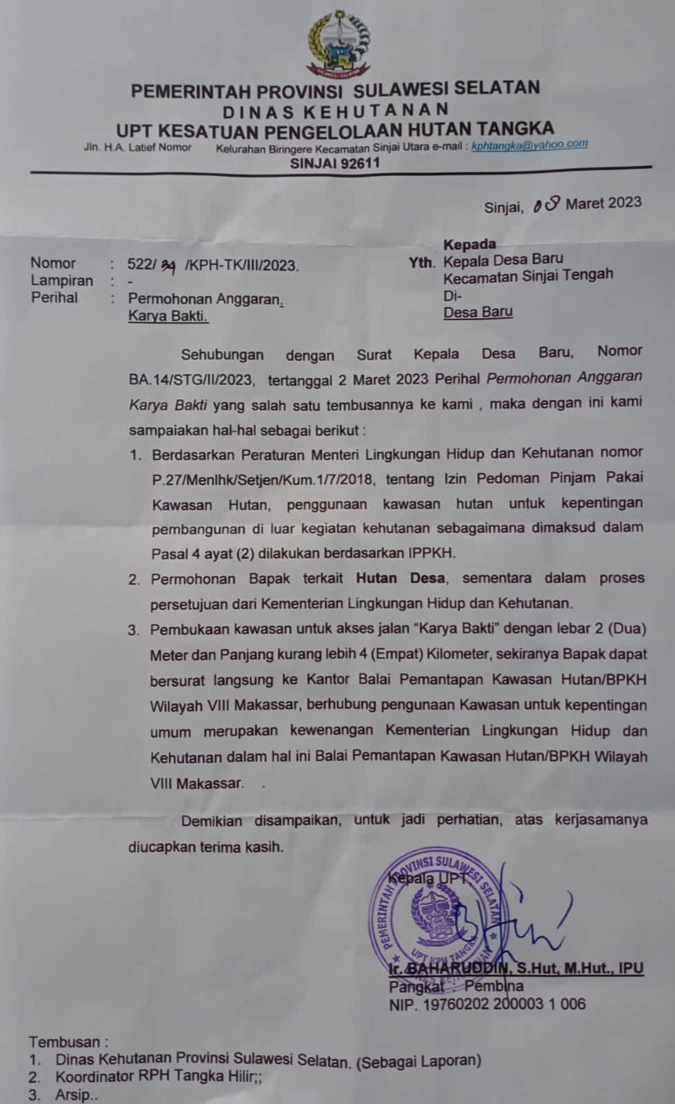 “Tidak ada surat izin penebangan pohon dalam kawasan hutan terletak di Desa Baru. Memang pernah diusulkan kawasan hutan untuk penurunan status kawasan hutan Desa. Tetapi sementara berproses. Jadi soal surat izin untuk Pengelolaan kayu bantalan tidak ada”, ungkap Mustafa MH pegawai kantor UPT KPH Tangka Sinjai.