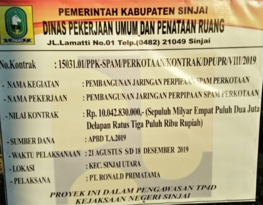 Dikatakan Pemkab Kabupaten Sinjai gelontorkan anggaran APBD sekitar Rp 10 Miliyar tahun 2019. Dikerja oleh dinas Pekerjaan Umum dan Penataan Ruang (PUPR) dengan PPTK Badri ST, ditengarai dokumen perencanaan tidak dibikin padahal ada anggaran untuk perencanaan diperkirakan sekitar Rp 300 juta.