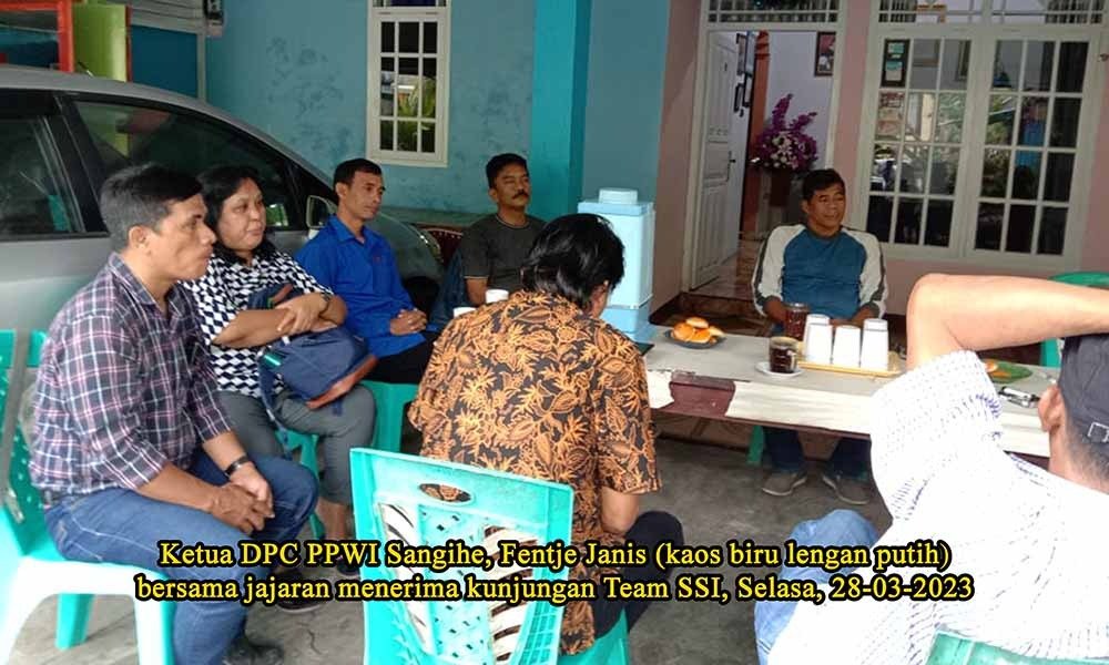 Tahuna – Ketua Save Sangihe Island (SSI), Jull Takaliuang, dan kawan-kawan melakukan kunjungan ke Sekretariat DPC PPWI Kabupaten Kepulauan Sangihe, Sulawesi Utara, Selasa (28/3/23). Team SSI disambut langsung Ketua PPWI Sangihe, Fentje Janis, S.H., S.Ip., S.Th, yang didampingi Wakil Ketua, Asriel Johan Tatande, S.E., Sekretaris, Ryvomoon T. Mumba, S.Pd., Wakil Sekretaris II, Jumbriyati Manabung, Bidang Organisasi, Rolly OA. Supit, dan Bidang Humas & Publikasi, Benyfasius Sasiang. Pertemuan berlangsung di Sekretariat DPC PPWI Sangihe, Jalan Tapuang Belakang, Kecamatan Tahuna Timur, Kabupaten Kepulauan Sangihe, Sulawesi.
