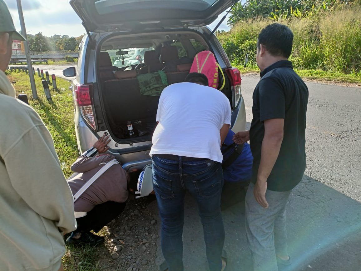 Dengan masih menggunakan seragam, petugas pun turun dari kendaraan untuk membantu memasang dan mengganti ban cadangan, Tak sampai 20 menit, permasalahan dari pemudik tersebutpun dapat tertangani serta dapat melanjutkan perjalanan kembali.