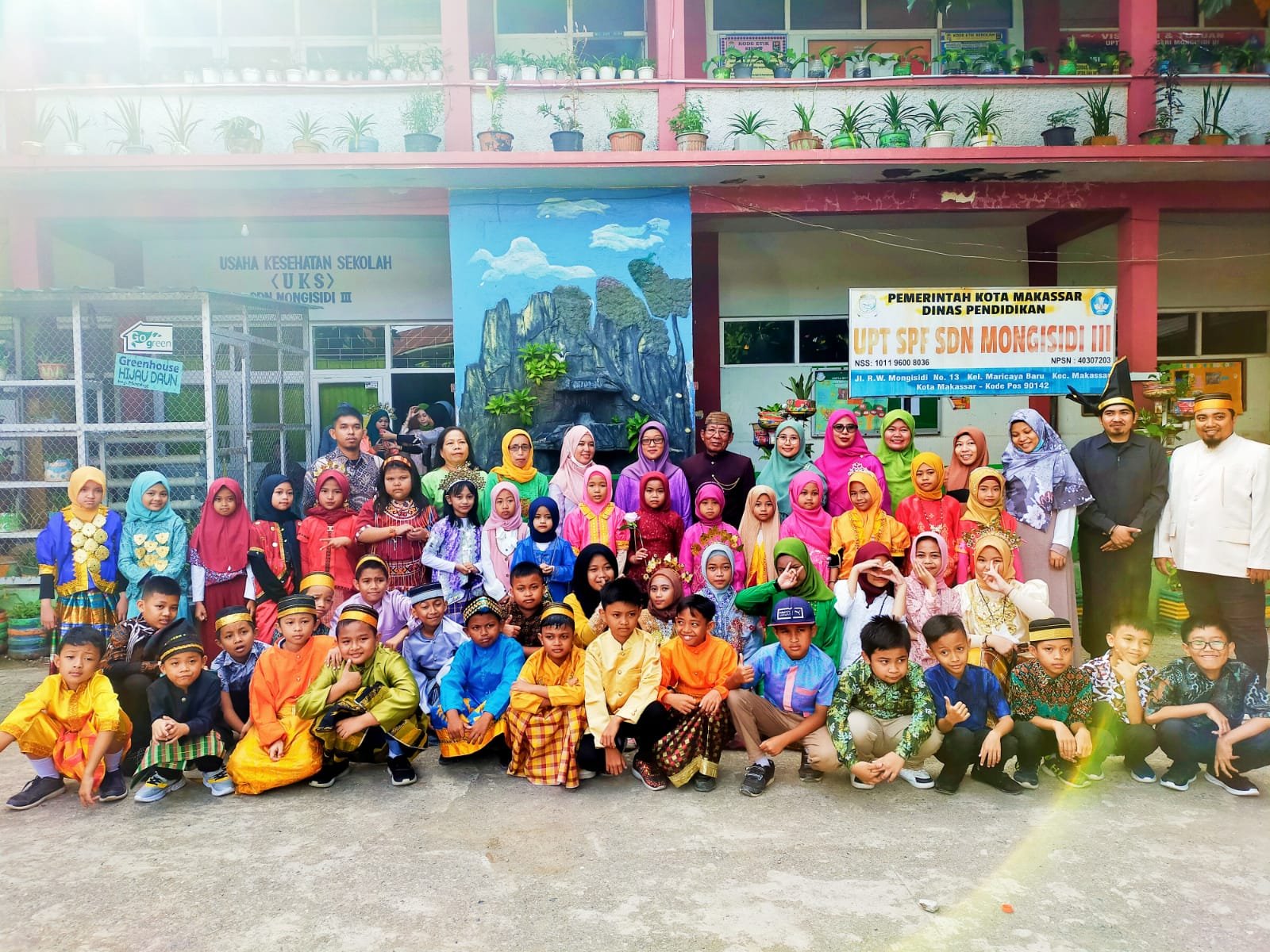 Kali ini, H. Andy Selle, S.Pd orang nomor satu di lingkungan SD Negeri Monginsidi III itu terlihat memakai jas tutup warna hitam, pakaian adat pria Makassar.