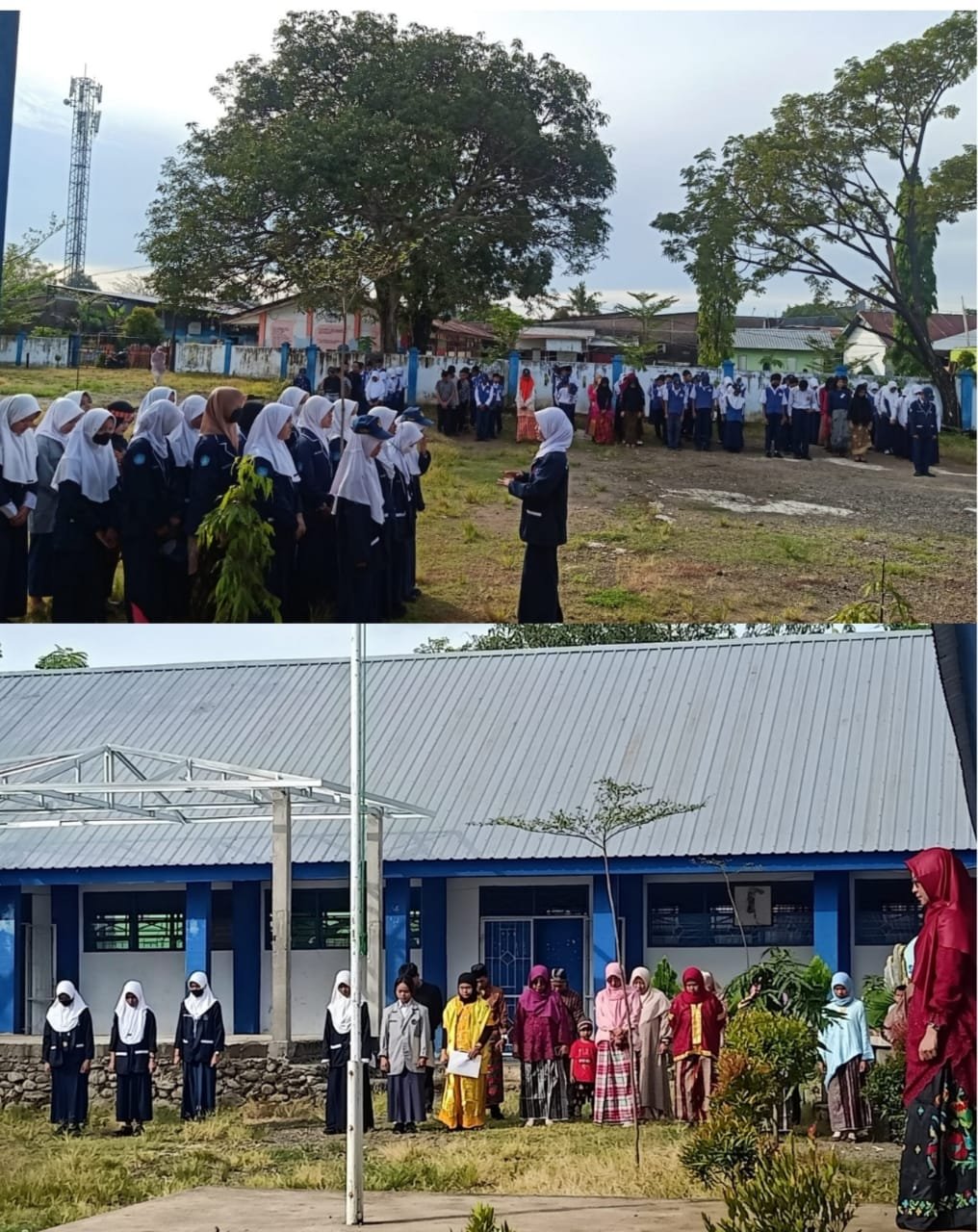Sementara siswa siswi lainnya tetap mengenakan seragam sekolah saat mengikuti upacara.