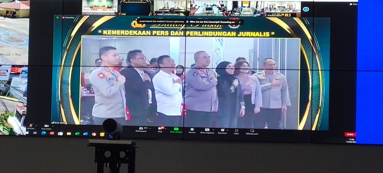 Terlihat Kasi Humas Polres Majene bersama para Pejabat Utama Polres Majene dan jurnalis mengikuti kegiatan tersebut melalui Zoom Meeting, di ruang Command Center Polres Majene.
