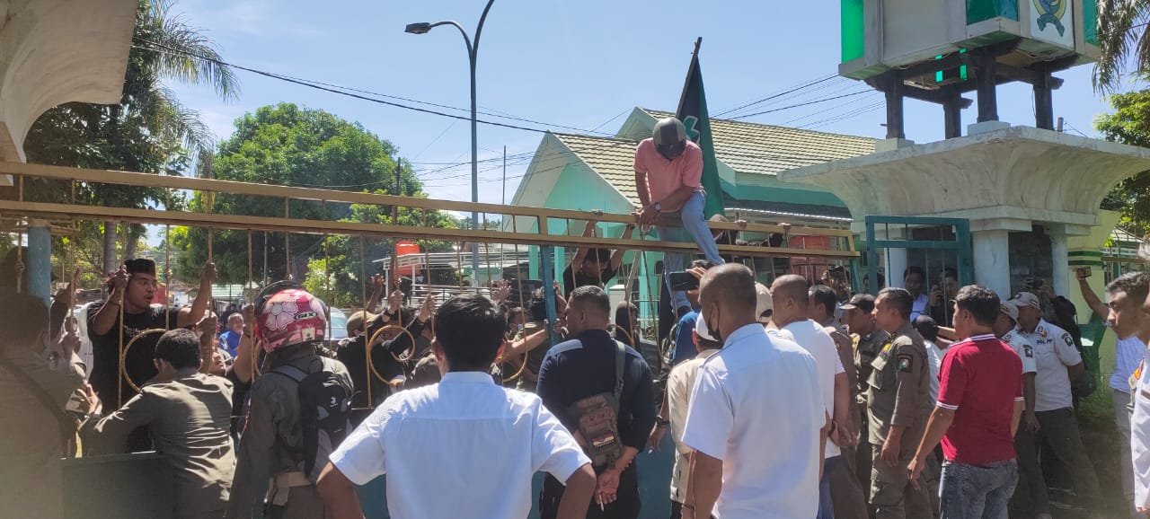 Mahasiswa yang dihadang aparat kepolisian dan Satpol PP di depan pagar Rumah Jabatan Bupati Majene ini akhirnya berhasil merangsek masuk dengan cara memanjat pagar dan menggoyangnya hingga ambruk.