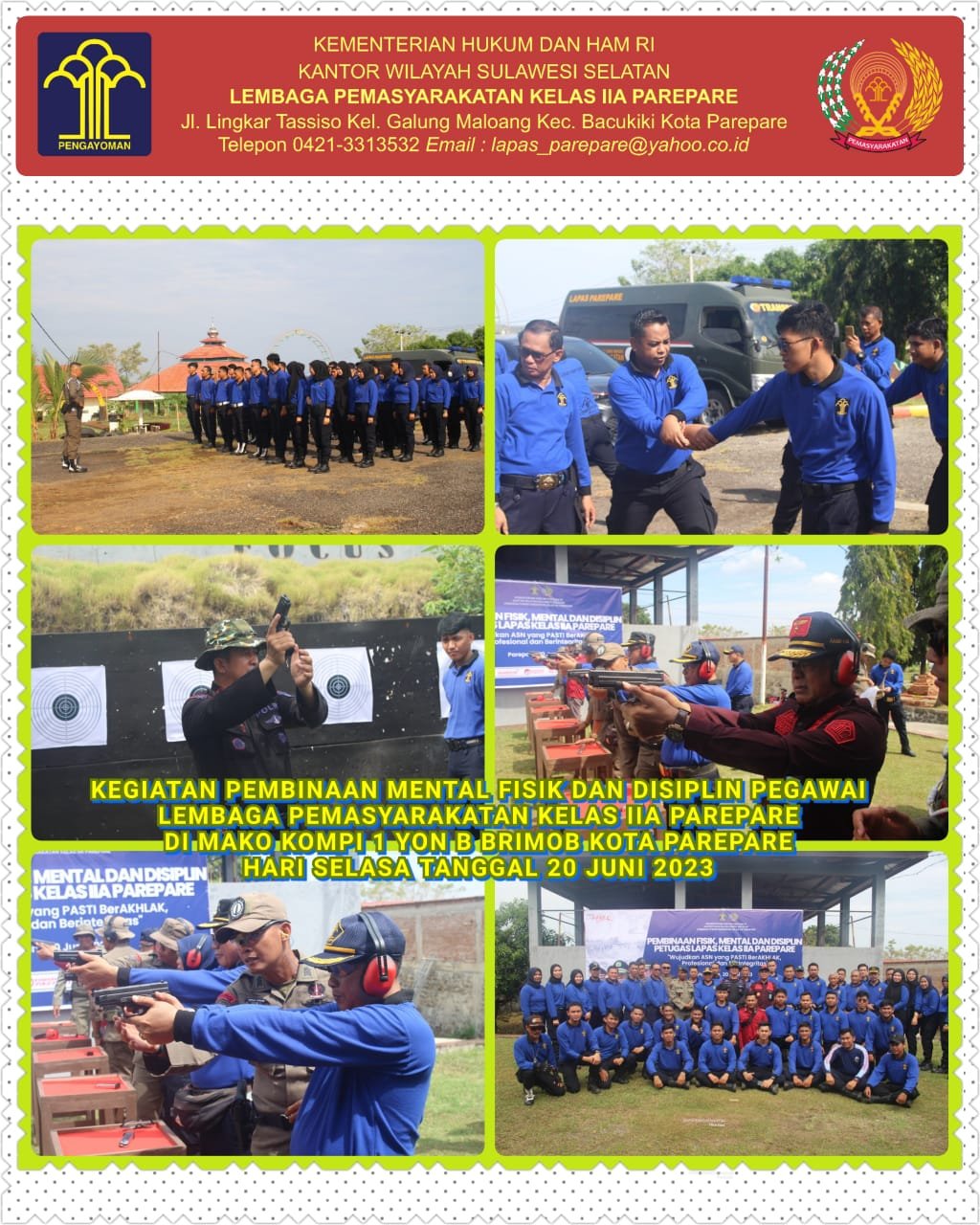 Hasil kegiatan Menembak Mahir Tepat Sasaran Petugas Lapas IIA Parepare skor tertinggi 1. Aditya Sulaiman nilai 44 (9,9,9,9,8), 2. Marwati nilai 43 (9,9,9,8,8) dan 3. Gilang Muhammad, SH nilai 42 (9,9,8,8,8) dan kepadanya diberikan piagam menembak tepat sasaran juara 1,2 dan 3 oleh Kepala Lapas IIA Parepare.