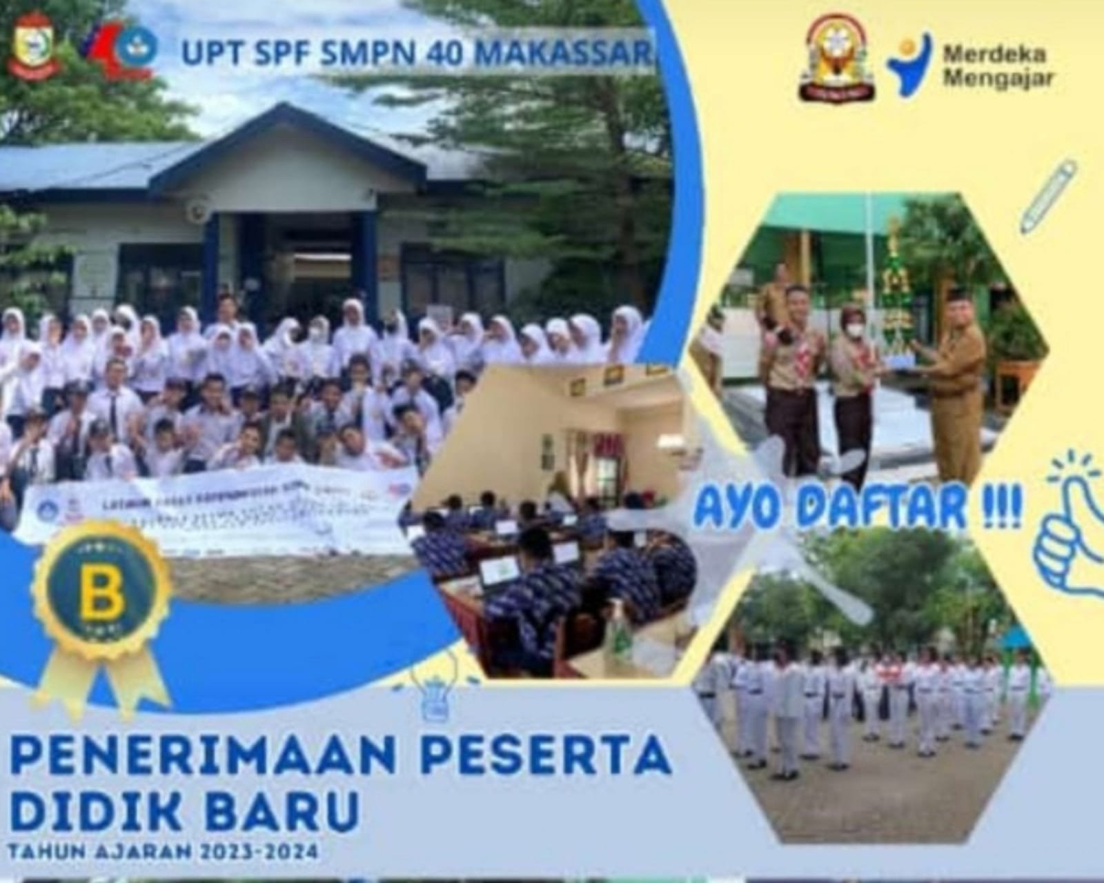 Sementara itu, Wakil Kepala Sekolah (Wakasek) UPT SPF SMPN 40 Makassar Bidang Kesiswaan, Hj. Erniwati, S.Pd M.Pd melalui caption status WhatsApp-nya yang dilansir pada Senin (19/6) pukul 22.55 Wita mengajak orang tua atau wali siswa agar segera mendaftarkan anaknya sekolah di SMPN 40.