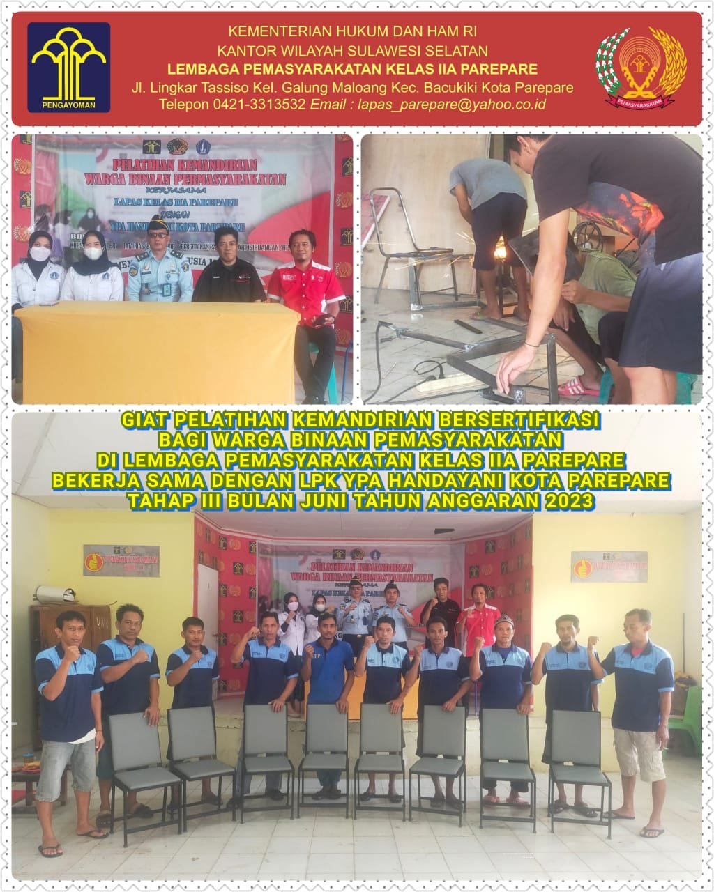 Kegiatan bekerja sama dengan Lembaga Pelatihan Kerja YPA HANDAYANI Kota Parepare dengan tenaga instruktur dari Dinas Tenaga Kerja dan UMKM Kota Parepare di dampingi langsung oleh Bapak Abdullah, SH, MH selaku Kepala Seksi Kegiatan Kerja, Kasubsi Sarana Kerja Syamsul Alam, SH dan Kasubsi Bimbingan Kerja dan Pengelolaan Hasil Kerja Abdul Rahman, SH, MH. Pelatihan sekaligus praktek pengelasan adalah kegiatan pelatihan kemandirian bersertifikasi paket ke 3 (Tiga) dengan peserta 10 orang warga binaan pemasyarakatan.