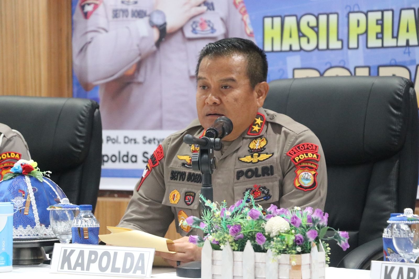 Makassar – Kapolda Sulsel Irjen Pol Drs. Setyo Boedi Moempoeni Harso, S.H., M.Hum didampingi Dirlantas, Kabidpropam Polda Sulsel dan Kabidhumas Polda Sulsel Kombespol Komang Suartana, S.H., S.I.K., M.H. menggelar Konferensi Pers hasil Operasi Patuh Pallawa 2023 di Aula Biru Ditlantas Polda Sulsel, Senin (24/07/23).