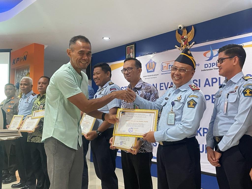 Piagam Penghargaan Peringkat Pertama diserahkan langsung oleh Kepala KPPN Parepare kepada Kepala Lapas IIA Parepare Totok Budiyanto, Amd.IP, SH.