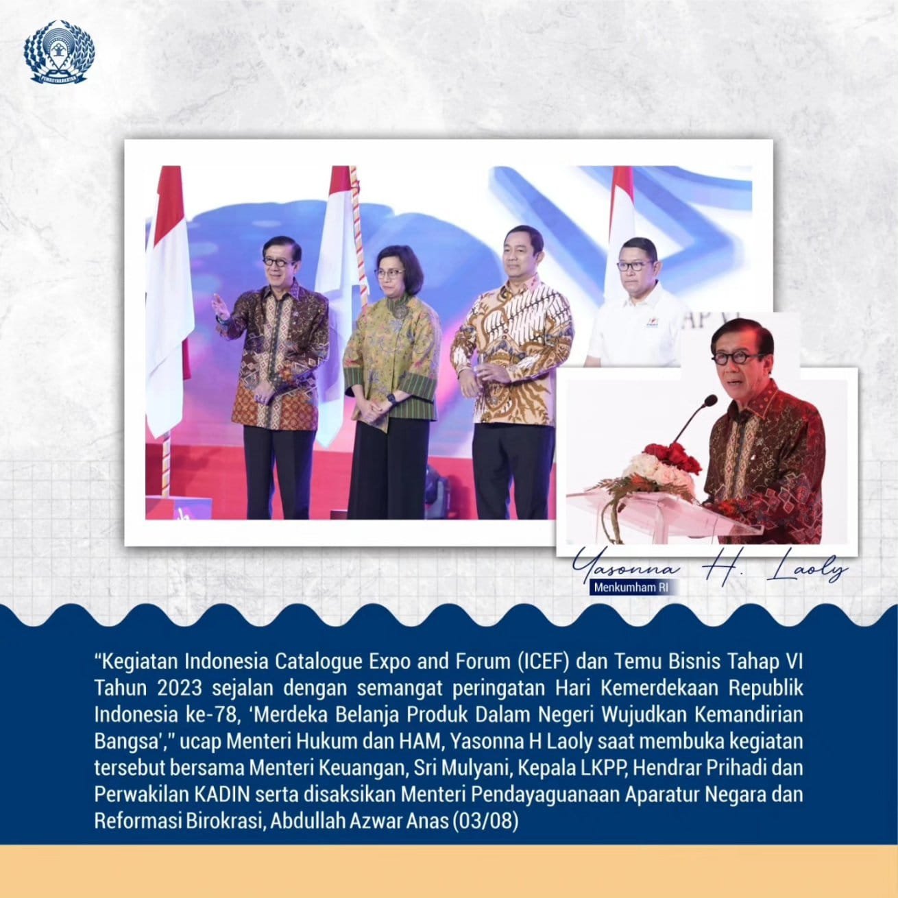 “Apresiasi dan ucapan terima kasih kami sampaikan juga kepada Jajaran Lembaga Kebijakan Pengadaan Barang/Jasa Pemerintah (LKPP) dan Jajaran Kamar Dagang dan Industri Indonesia (KADIN) atas kerjasama, sinergi, dan kolaborasinya yang telah mengintegrasikan Indonesia Catalogue Expo and Forum (ICEF) dengan Temu Bisnis Tahap VI.” ucap Yasonna.