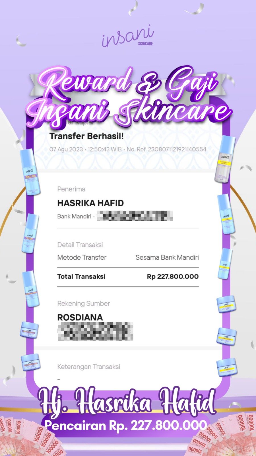 Pada tanggal, 7 Agustus 2023, Insani Cosmestic memberikan bonus berupa Reward dan Gaji ke Distributor dan Agennya ke Seluruh Indonesia dengan total bonus mencapai 2 Milyar Rupiah