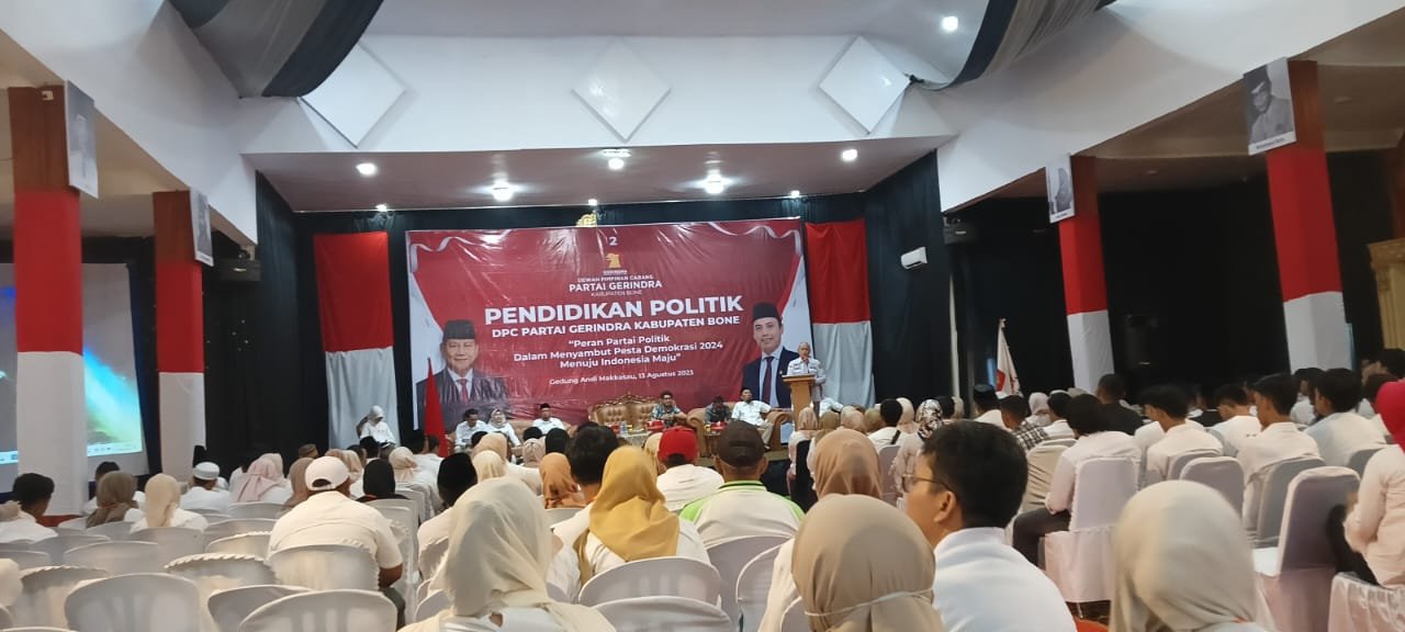 Partai Gerindra Kabupaten Bone, Sulawesi Selatan menggelar Pendidikan Politik di Gedung Andi Makkasau, Kabupaten Bone, Ahad (13/8/2023).