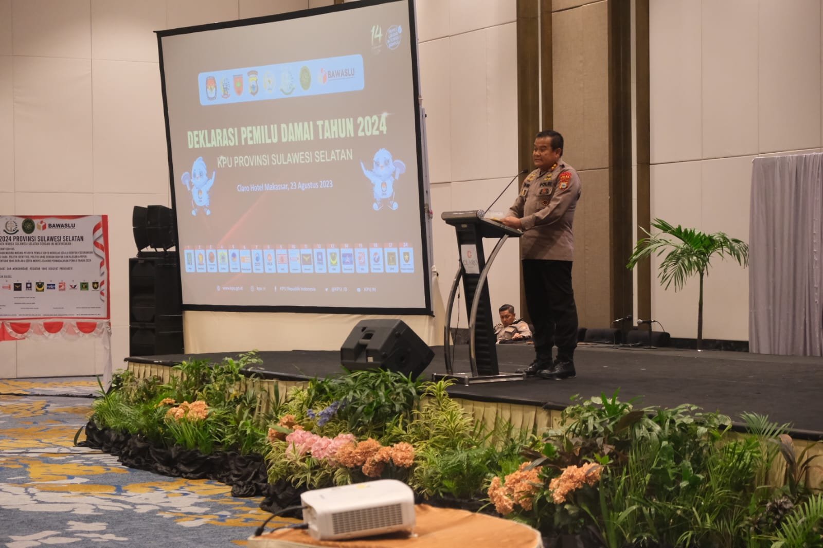 Kapolda Sulsel Irjen Pol Drs. Setyo Boedi Moempoeni Harso, S.H., M.Hum menghadiri deklarasi pemilu damai bersama forkopimda, parpol, penyelengara pemilu dan ormas serta relawan se-Provinsi Sulsel di Hotel Claro, Kota Makassar, Rabu (23/8/2023).