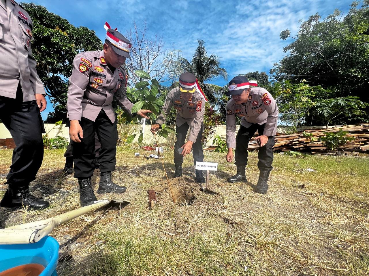 PAREPARE — Sebagai wujud dukungan terhadap pelestarian lingkungan, personel Polres Parepare, Sulawesi Selatan (Sulsel) beserta pengurus Bhayangkari, melakakukan penanaman 1.600 bibit pohon mahoni secara serentak di sejumlah titik di Kota Parepare, Rabu (23/1/8/2023).