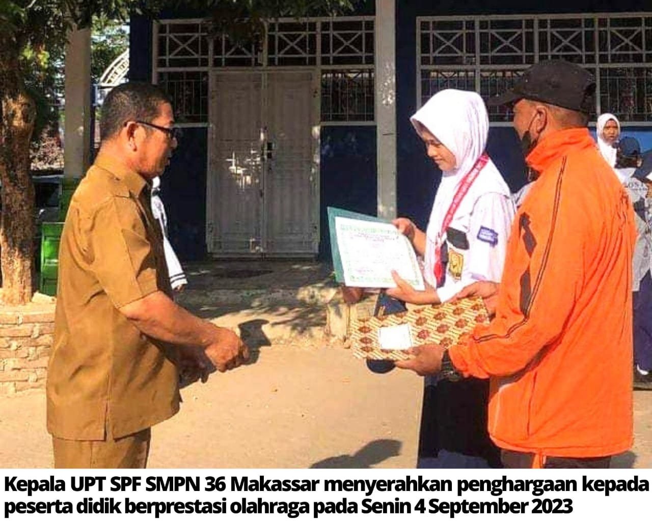 “Penyerahan penghargaan sebagai salah satu bentuk apresiasi kepada peserta didik yang memiliki prestasi. Medali perunggu lompat jauh putri kejuaraan atletik pelajar tingkat kota Makassar 2023 dan atlit tolak peluru mewakili Sulawesi Selatan pada kegiatan PEPARPENAS Palembang 2023. Menyampaikan terima kasih kepada semua peserta didik yang sudah ikut terlibat dan berpartisipasi dalam berbagai event tingkat Kota Makassar, sampaikan salam hormat kami kepada orang tua kalian. Silahkan tunjukkan bakat dan kemampuan serta prestasimu jangan menunggu sempurna karena sejatinya kesempurnaan hanya milik Allah SWT,” seperti dikutip dari akun Facebook resmi @smpnegeritigaenammakassar yang diunggah (4/9/2023).