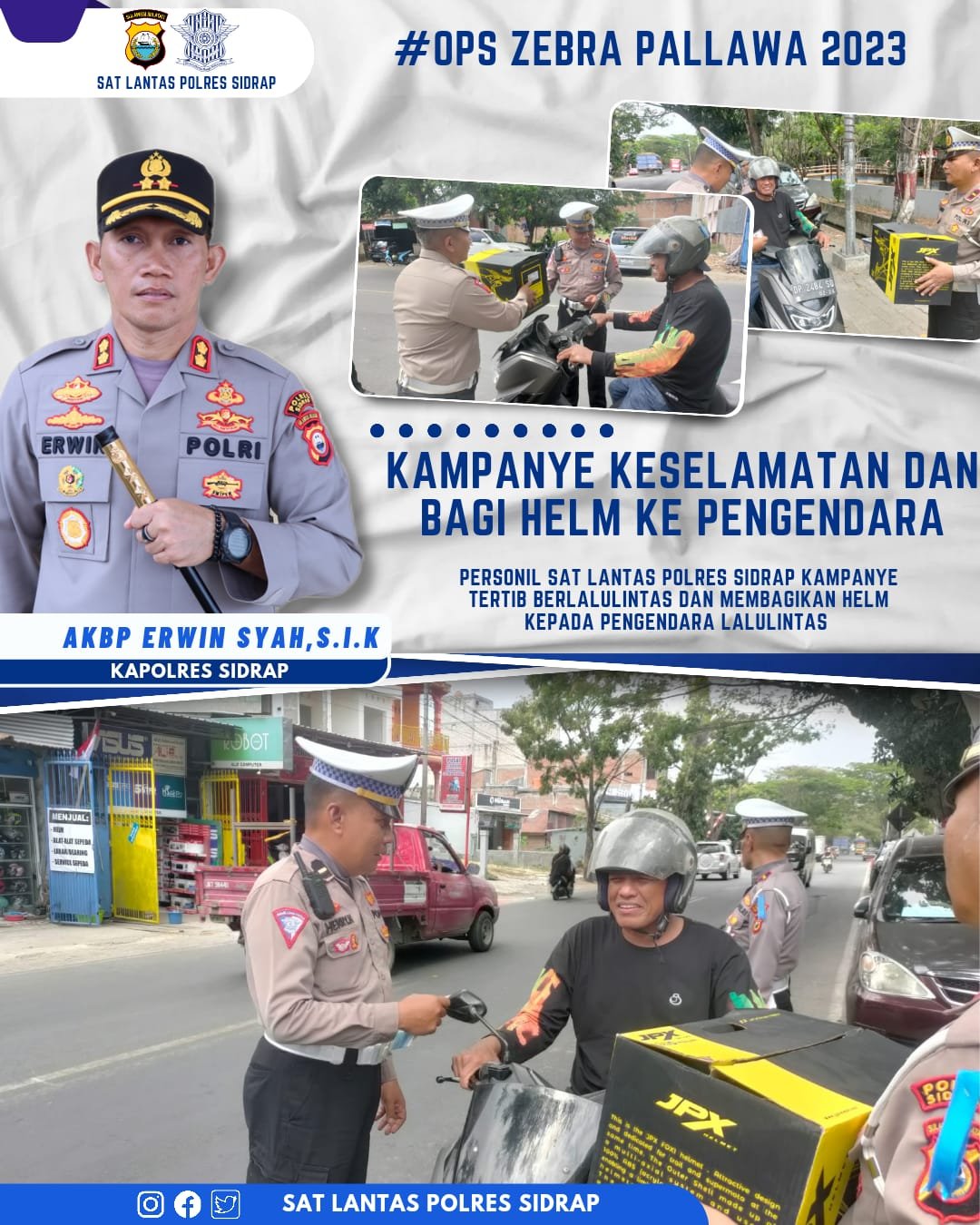 kosongsatunews.com, SIDRAP – Hari Ketiga Operasi Zebra Pallawa 2023, Sat Lantas Polres Sidrap melaksanakan kampanye keselamatan tertib berlalu lintas dengan membagikan Helm ke Pengendara di Jalan Jenderal Sudirman, Kelurahan Pangkajene, Kab Sidrap, Rabu (06/09/2023).