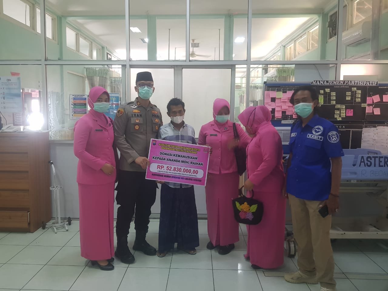 Iptu Ivan Danara beserta Ketua Bhayangkari Ranting Sokobanah Ny. Dhiyas Ivan Danara Oktavian membuka open donasi untuk membantu biaya operasi penyambungan tangan Ahmad Raihan di RSUD dr. Soetomo Surabaya.