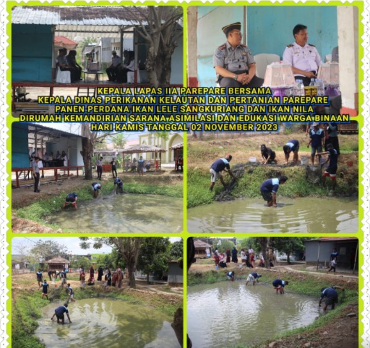 Hal ini sebagai tindak lanjut dari Perjanjian Kerja Sama yang telah ditandatangani bersama. Hasilnya sangat luar biasa. Selama ini petugas kami dengan intens memberikan pendampingan dan penyuluhan kepada warga binaan sebagai kelompok tani. Apresiasi setinggi-tingginya kepada Kepala Lapas IIA Parepare yang telah membuat terobosan baru dengan membangun inovasi ”Rumah Kemandirian Sarana Asimilasi Edukasi Lapas IIA Parepare” yang merupakan sentral program pembinaan dan bimbingan kemandirian bagi warga binaan bidang pertanian perkebunan perikanan. Sehingga hari ini bisa panen perdana ikan Lele Sangkuriang dan ikan Nila.