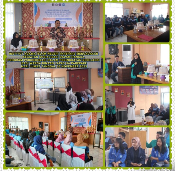 kosongsatunews.com, PAREPARE—Bertempat di ruang rapat Lapas IIA Parepare telah dilaksanakan kegiatan Sosialisasi Program Psikoedukasi Dalam Meningkatkan Resiliansi Bagi Warga Binaan Pemasyarakatan yang diselenggarakan oleh Institut Agama Islam Negeri Parepare. Jumat,(3/11/2023)