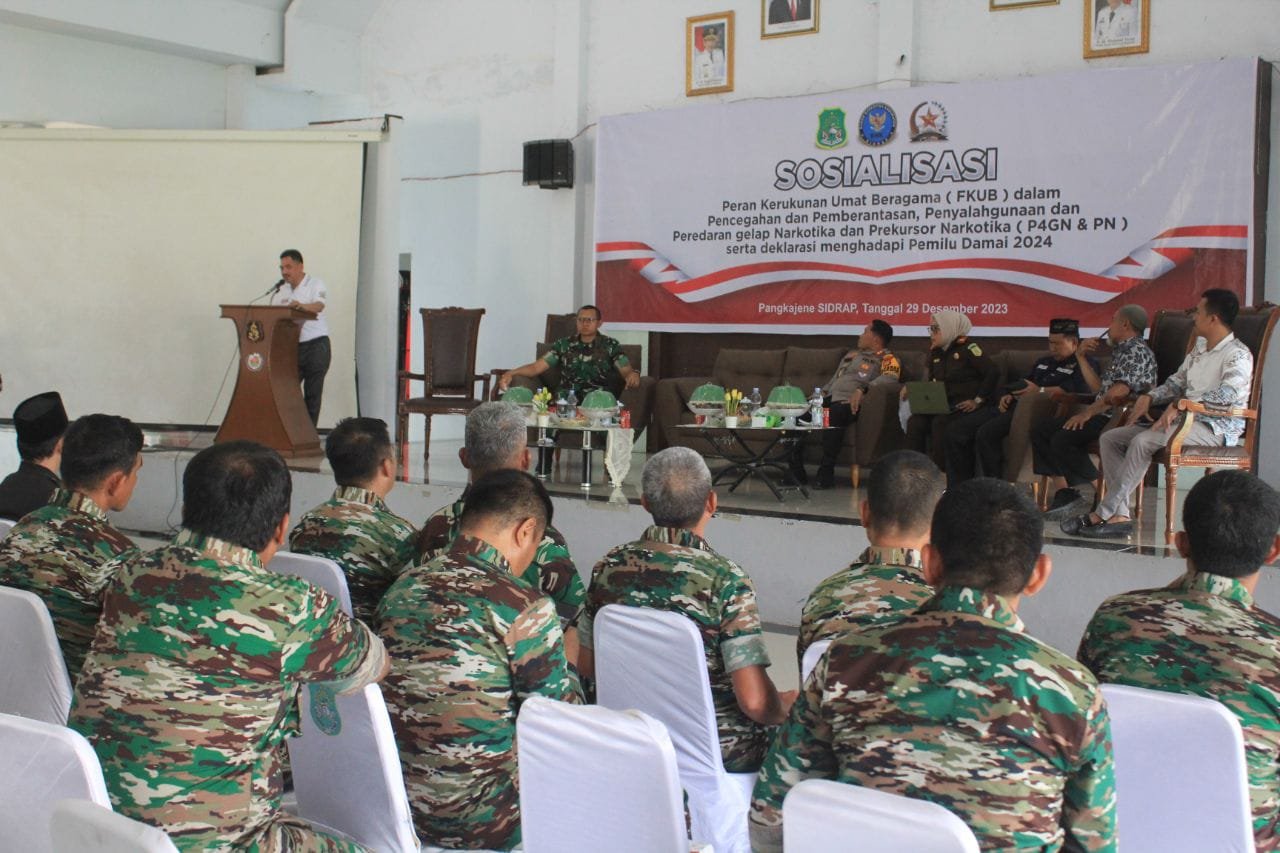 kosongsatunews.com, SIDRAP – Dandim 1420/Sidrap Letkol Inf Andika Ari Prihantoro, SE., M.I.Pol., menghadiri sosialisasi yang diselenggarakan oleh Badan Kesbangpol dengan tema “Peran Forum Kerukunan Umat Beragama (FKUB) dalam Pencegahan dan Pemberantasan Penyalahgunaan dan Peredaran Gelap Narkotika dan Prekursor Narkotika (P4GN & PN)”.